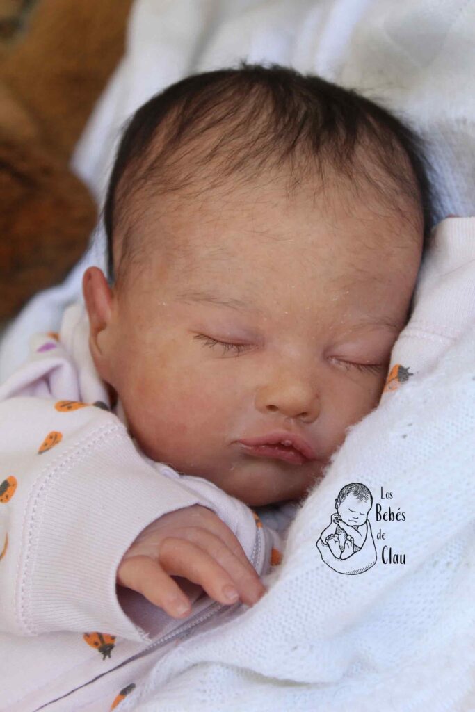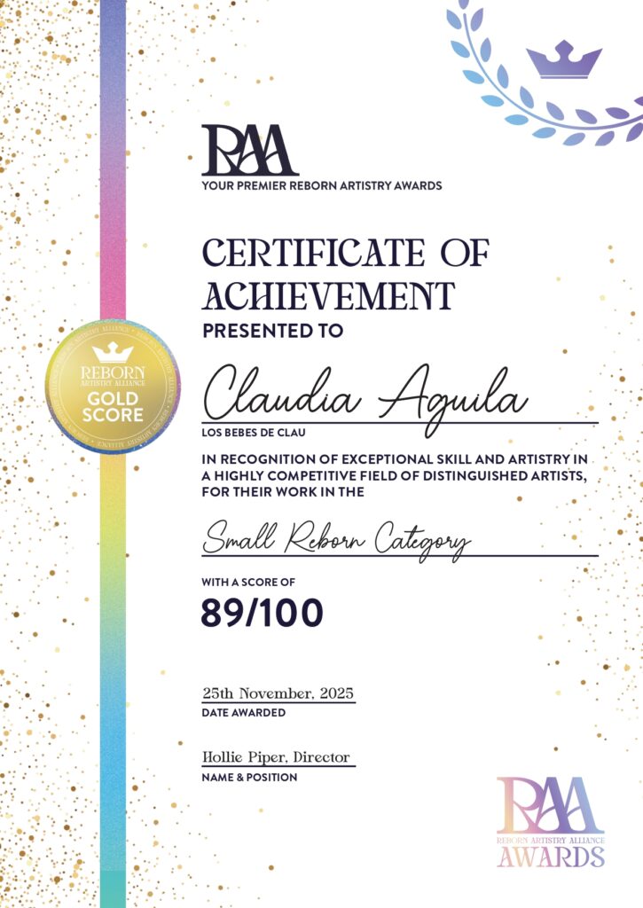 La primera Bebé reborn que hice en 2025. Con ella participé en el evento final organizado por RAA (Reborn Artistry Alliance) y obtuve un puntaje de oro (89/100) en la categoría de «Small Reborns». Esta bebé ya fue adoptada y entregada a su mamá en Estados Unidos