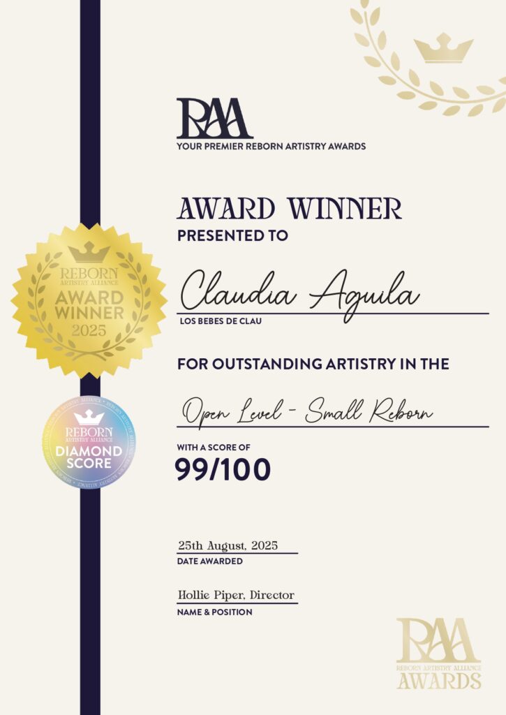 Bebé reborn recién nacido de 45 cm, con pequeños granitos tipo acné neonatal en su cara. Con Piper participé en el tercer evento organizado por RAA (Reborn Artistry Alliance) y gané el 1° lugar con un puntaje de 99/100 en la categoría de «Open Level-Small Reborn». Esta bebé ya fue adoptada y entregada a su mamá. Dejo las fotos como parte de mi portafolio artístico