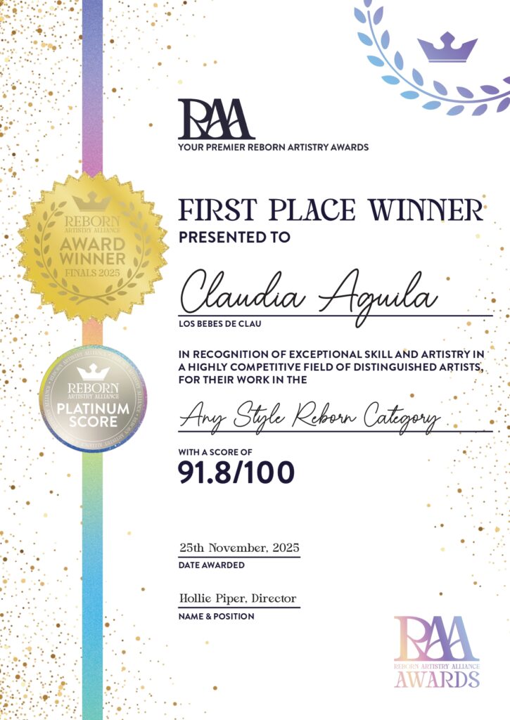 Bebé Reborn recién nacido de 45 cm, con pequeñas marcas de nacimiento «marca de fresa» (hemangioma). Con Spencer participé en el evento final del año 2025 organizado por RAA (Reborn Artistry Alliance) y gané el 1° lugar con un puntaje perfecto 91.8/100 en la categoría de «Any Style Reborn». Este bebé ya fue adoptado y entregado a su mamá. Dejo las fotos como parte de mi portafolio artístico
