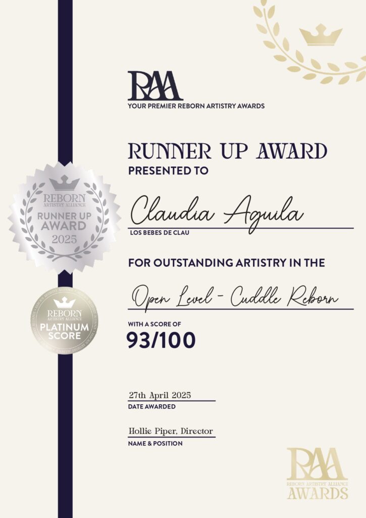 Bebé reborn de 3 meses estilo cuddle baby! Y también fue el primer cuerpo de tela totalmente confeccionado por mí. Con ella participé en el segundo evento organizado por RAA (Reborn Artistry Alliance) y quedé en 2° lugar con un puntaje de 93/100 en la categoría de «Cuddle Reborn». Esta bebé ya fue adoptada y entregada a su mamá